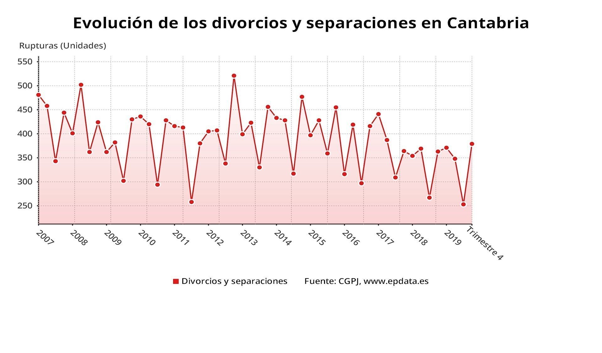 Poniendo en relación las demandas de disolución matrimonial con la población, Cantabria registró 23,3 por cada diez mil habitantes, exactamente la misma tasa que registra la media del conjunto del país. A la cabeza se encuentra la Comunidad Valenciana, con un total de 26,7. Le siguen Baleares, con 26,5; Canarias, con 25,7; Andalucía, con 24,3, y Cataluña, 24.