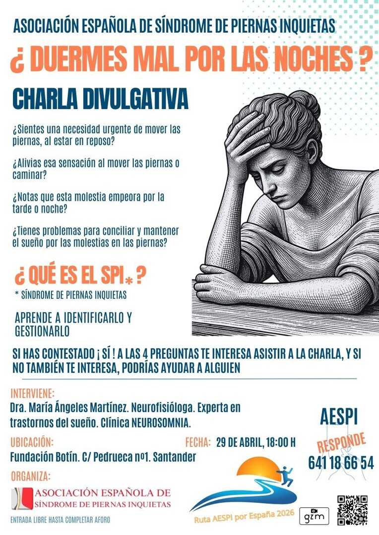La 'Ruta AESPI 2026', organizada por la Asociación Española del Síndrome de Piernas Inquietas (AESPI), que recorrerá todo el país, llegará a Cantabria el próximo miércoles 29 para dar visibilidad a esta enfermedad neurológica que afecta gravemente al descanso y la calidad de vida.