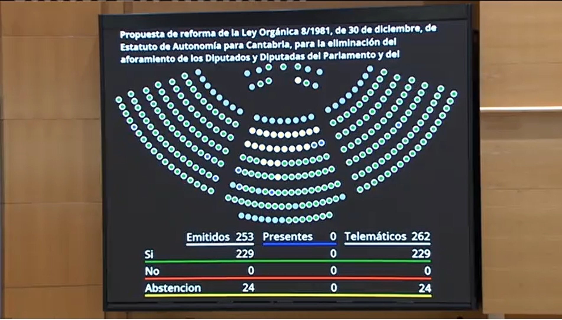 El Pleno del Senado ha aprobado este miércoles, con 229 votos a favor, 24 abstenciones y ningún voto en contra, la reforma del Estatuto de Cantabria de manera definitiva para suprimir los aforamientos, por lo que, al no haberse introducido ningún cambio del texto que venía del Congreso, esta modificación entrará en vigor una vez se publique en el Boletín Oficial del Estado (BOE).