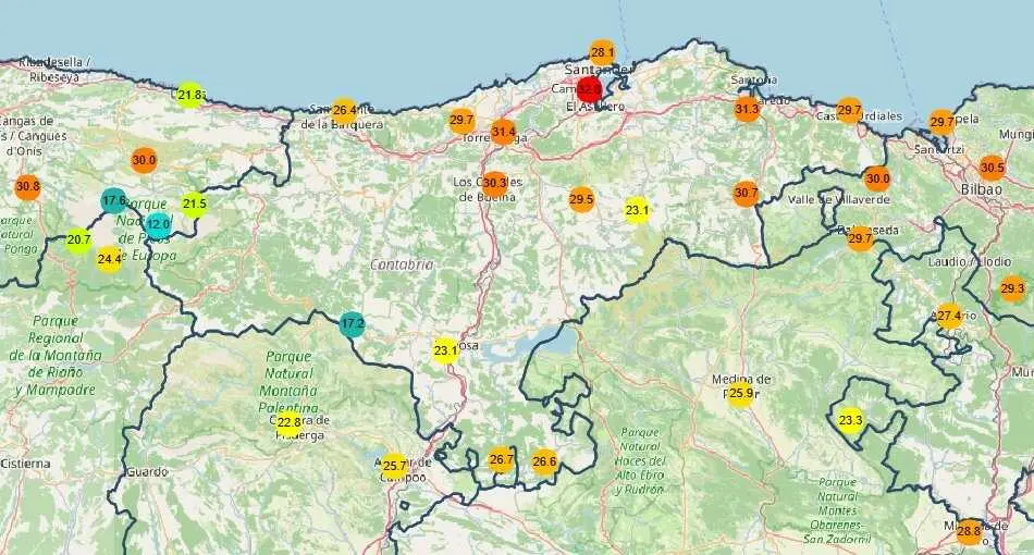 Por otro lado, rebasaron los 30 grados los municipios de Torrelavega (31,4ºC), Laredo (31,3ºC), Ramales de la Victoria (30,9ªC) y San Felices de Buelna (30,7º).