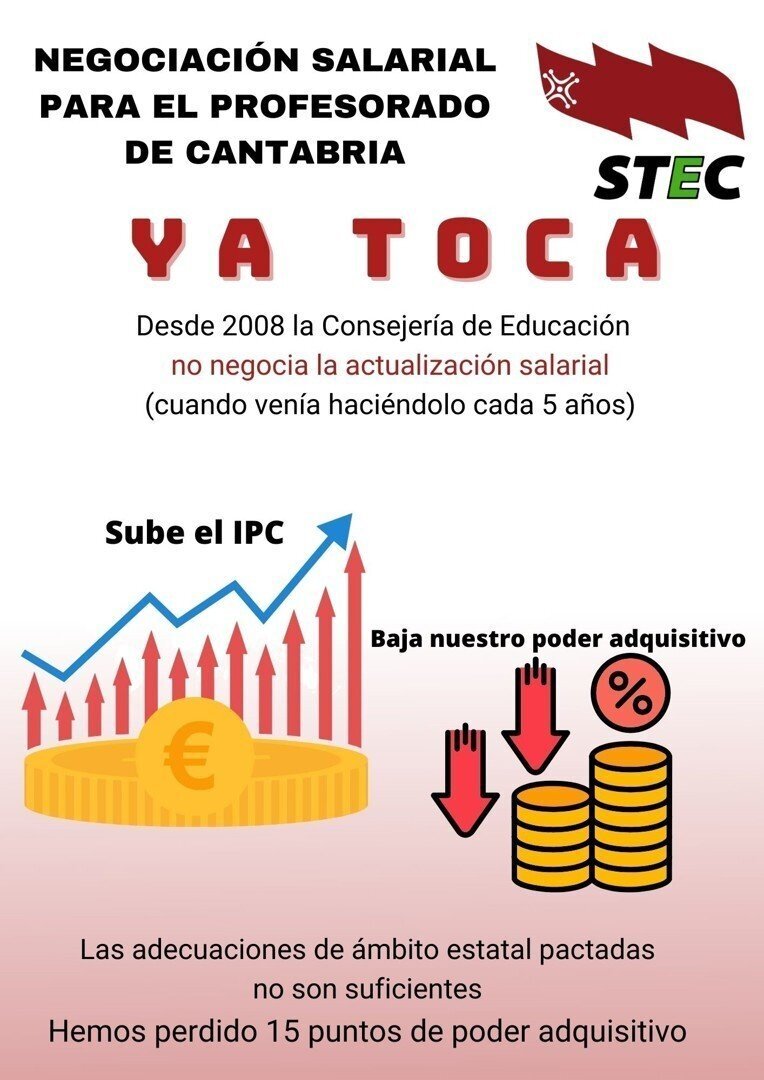 Desde la asunción de las competencias educativas, los complementos autonómicos venían renovándose cada cinco años. Así se hizo en 1998, 2003 y 2008, situando a Cantabria en una de las comunidades que mejor valoraba salarialmente a sus docentes. Sin embargo, STEC ha denunciado que son ya 15 años sin negociar una adecuación salarial en el ámbito autonómico, lo que unido a la subida de los precios en los últimos años y las "insuficientes actualizaciones" pactadas en el ámbito estatal, arroja como resultado una pérdida de poder adquisitivo de 15 puntos.