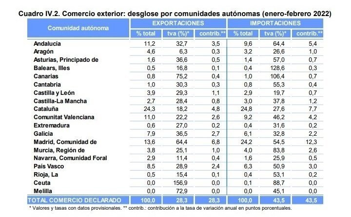En cuanto a las importaciones, Cantabria también fue la sexta comunidad autónoma con mayor incremento (55,3%) en estos dos primeros meses del año respecto al mismo periodo del año pasado.