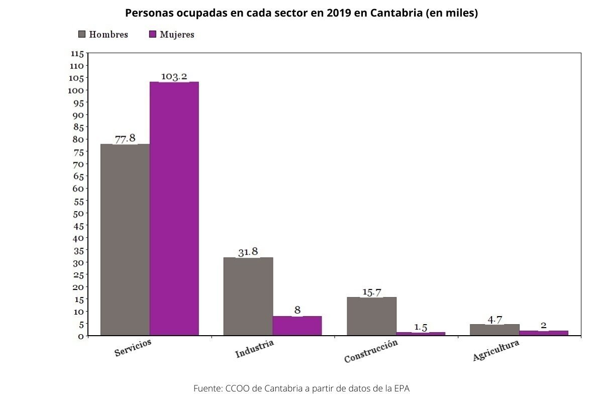 De este modo, el sector servicios ocupó en 2019 a 103.200 mujeres y a 77.800 hombres, siendo el único con mayor presencia de femenina. El agrario ocupó a unas 2.000 mujeres frente a 4.700 hombres; la construcción, a 1.500 mujeres y 15.700 hombres, y la industria a 8.000 mujeres frente a 31.800 hombres.