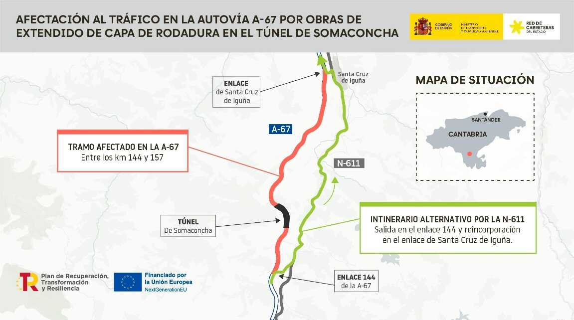 Así lo ha informado este lunes el Ministerio de Transportes y Movilidad Sostenible, que ha anunciado que se establecerá un itinerario alternativo, debidamente señalizado, para circular por la carretera N-611, desde la salida en el enlace 144 de la A-67 hasta la reincorporación a la autovía en el enlace de Santa Cruz de Iguña en el km 157.