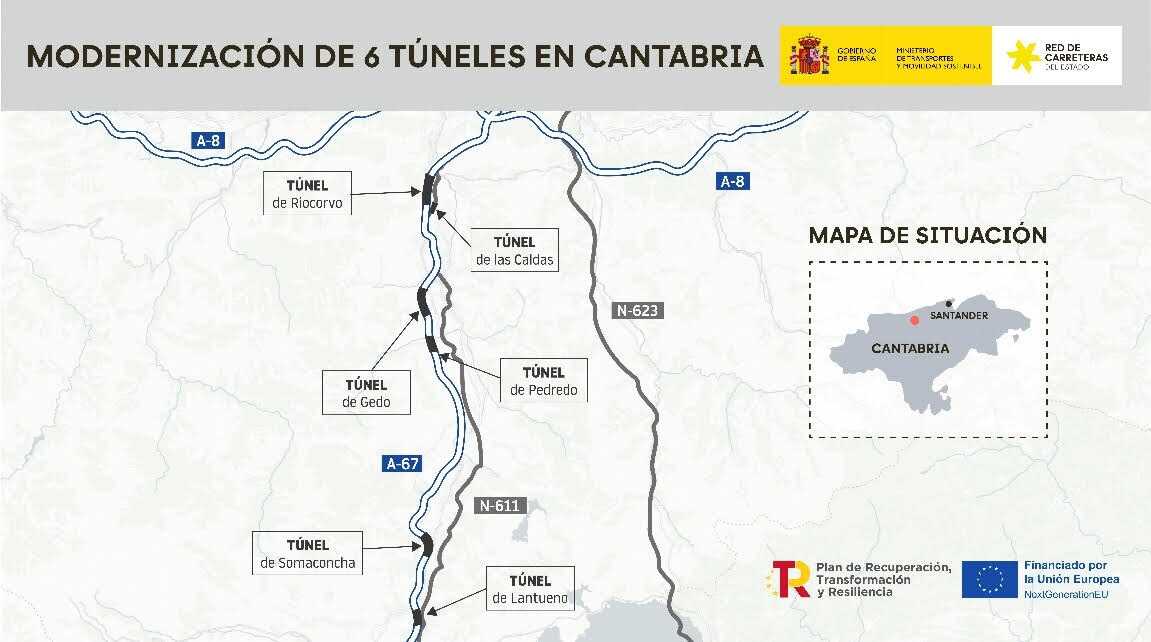 El Ministerio de Transportes y Movilidad Sostenible continúa ejecutando las obras de modernización de los túneles de Gedo, Somaconcha, Lantueno, Las Caldas, Riocorvo y Pedredo, situados en la autovía A-67, en Cantabria, con un presupuesto total de 31,3 millones de euros (IVA incluido) financiado por Plan de Recuperación, Transformación y Resiliencia (PRTR).