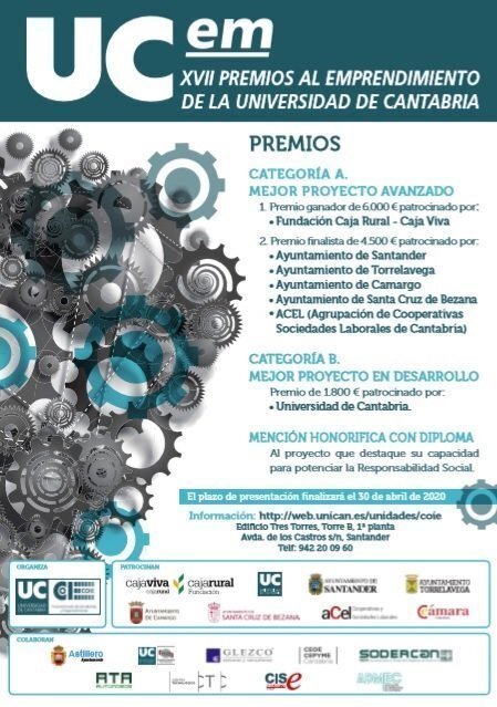 La Universidad de Cantabria (UC) ha convocado los XVII Premios al Emprendimiento Universitario (Premios UCem), dirigidos a estudiantes matriculados y a egresados de cualquier titulación de la institución académica que hayan finalizado sus estudios en los últimos seis años.