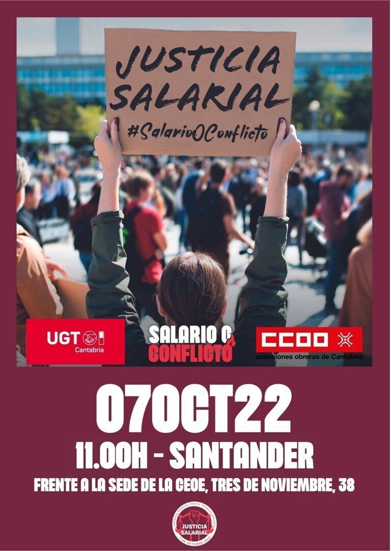 UGT y CCOO de Cantabria han convocado este viernes, 7 de octubre, una concentración de protesta ante la sede de la CEOE, en la calle Tres de Noviembre de Santander, a partir de las 11 horas, para exigir a la patronal "justicia salarial" y "el desbloqueo" del acuerdo de negociación colectiva.