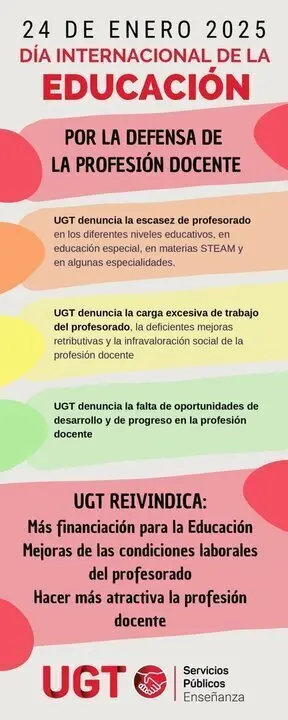 El Sector de Enseñanza de UGT Cantabria Servicios Públicos ha reivindicado, con motivo del Día Internacional de la Educación que se celebra este 24 de enero, el derecho a una educación de calidad para todos, así como la necesidad "urgente" de "revalorizar" la profesión docente.