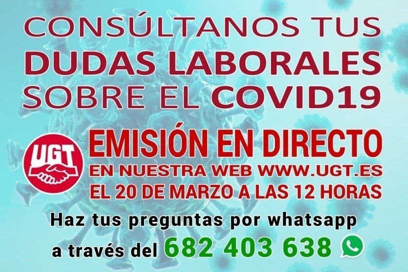 UGT iniciará hoy un consultorio on-line semanal para resolver todas las dudas laborales relacionadas con el coronavirus, en una emisión en directo en su página web (www.ugt.es) que se iniciará a las 12.00 horas y a la que se podrá acceder a través del teléfono de WhatsApp 682 403 638.