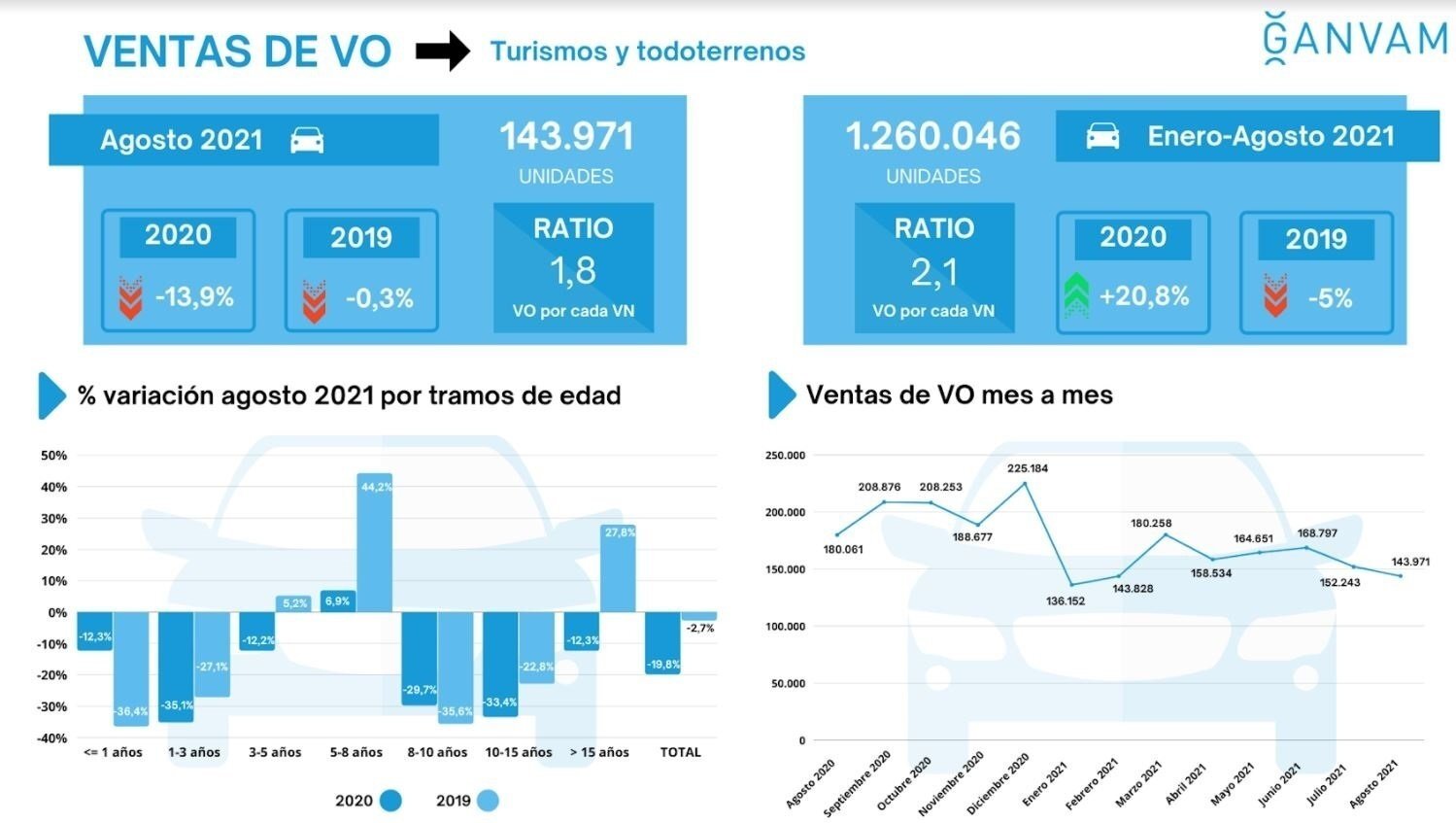En los primeros ocho meses del año, el mercado de ocasión acumula un total de 1.206.046 unidades vendidas, lo que supone un 20,8% más, aunque todavía un 5% menos que en el mismo periodo de 2019, lo que sitúa el ratio VO/VN en 2,1 a 1 hasta agosto.