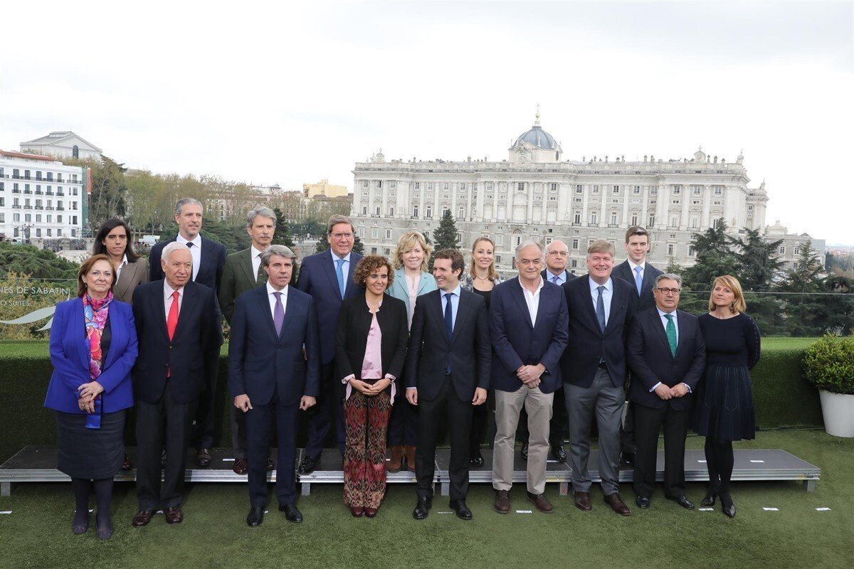 En la foto de familia, que ha tenido lugar en la terraza de los Apartosuites Jardínes Sabatini, con vistas al Palacio Real de Madrid, Casado ha posado flanqueado por Montserrat y González Pons. En esa instantánea figuran también como novedades Ana Collado -que asesoró a Mariano Rajoy y también trabajó para FAES--, además de Corro.