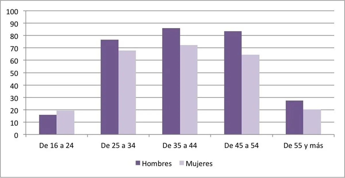 Del mismo modo, las tasas de empleo son mayores en hombres que en mujeres, siendo especialmente significativo que en las franjas de edad de 35 a 44 y de 45 a 54 años la diferencia es aún más acusada, llegando en el segundo caso al 19% durante el segundo trimestre de 2018.