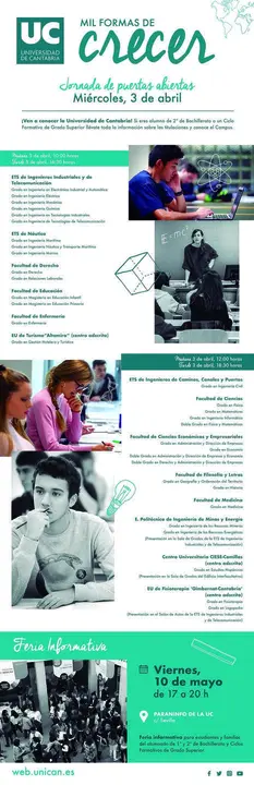 La información que los estudiantes obtengan en esta jornada se podrá completar con la visita a la Feria Informativa, que tendrá lugar el 10 de mayo, de 17.00 a 20.00 horas, en el Paraninfo de la Universidad de Cantabria.