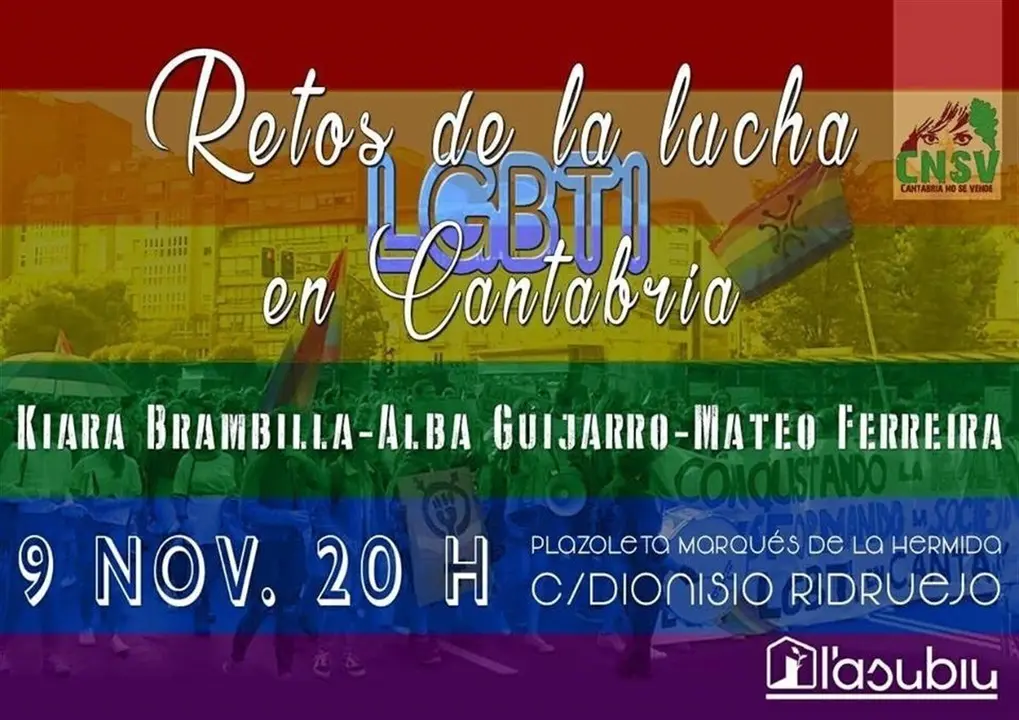 El espacio social y cultural L'Asubiu, en la Plazoleta de la calle Marqués de la Hermida (Plaza Dioniso Ridruejo), en Santander, acogerá este viernes, 9 de noviembre, a las 20.00 horas, el encuentro 'Retos de la lucha LGBTI en Cantabria', organizado por Cantabria No Se Vende (CNSV).