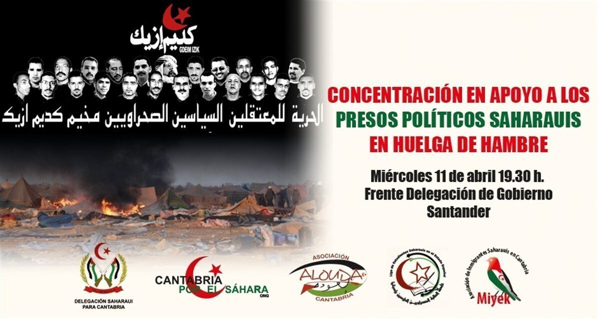 Las asociaciones Cantabria por el Sáhara, Alouda Cantabria, la Delegación Saharaui en Cantabria, junto a la Liga de Estudiantes y Jóvenes Saharauis del Estado Español en Cantabria (LEJSEE) y la Asociación de Inmigrantes Saharauis en Cantabria 'MiyeK' se concentrarán este miércoles 11, a las 19.30 horas, frente a la Delegación del Gobierno, para mostrar su solidaridad con los presos del Campamento Gdeim Izik que se encuentran en huelga de hambre en protesta por las "injustas condenadas y las condiciones infrahumanas" que están sufriendo en las cárceles marroquíes.