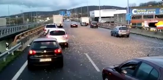 La persona que grabó el suceso ocurrido ayer por la tarde en la autovía A67 a su paso por Torrelavega desde el asiento del copiloto de otro camión, en conversación con ifomo, no comenta lo siguiente: