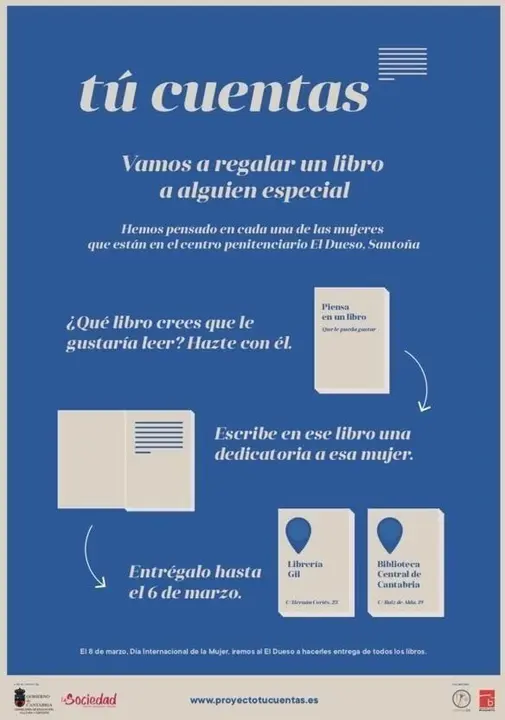 La Consejería de Educación, Cultura y Deporte del Gobierno de Cantabria participa en el programa 'Tú cuentas', que tiene por objeto regalar a las reclusas de El Dueso, en Santoña, un libro entregado por las personas que quieran participar en esta iniciativa, a las que se les pide que dediquen el volumen.