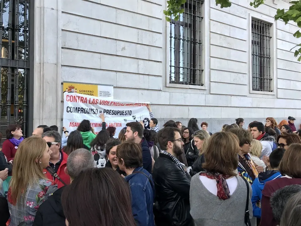 La concentración ha tenido lugar frente a la Delegación del Gobierno en Cantabria, en cuya fachada el colectivo feminista ha colgado una pancarta con el lema "Contra las violencias machistas, compromiso=presupuesto. Asamblea Feminista Abierta de Cantabria".