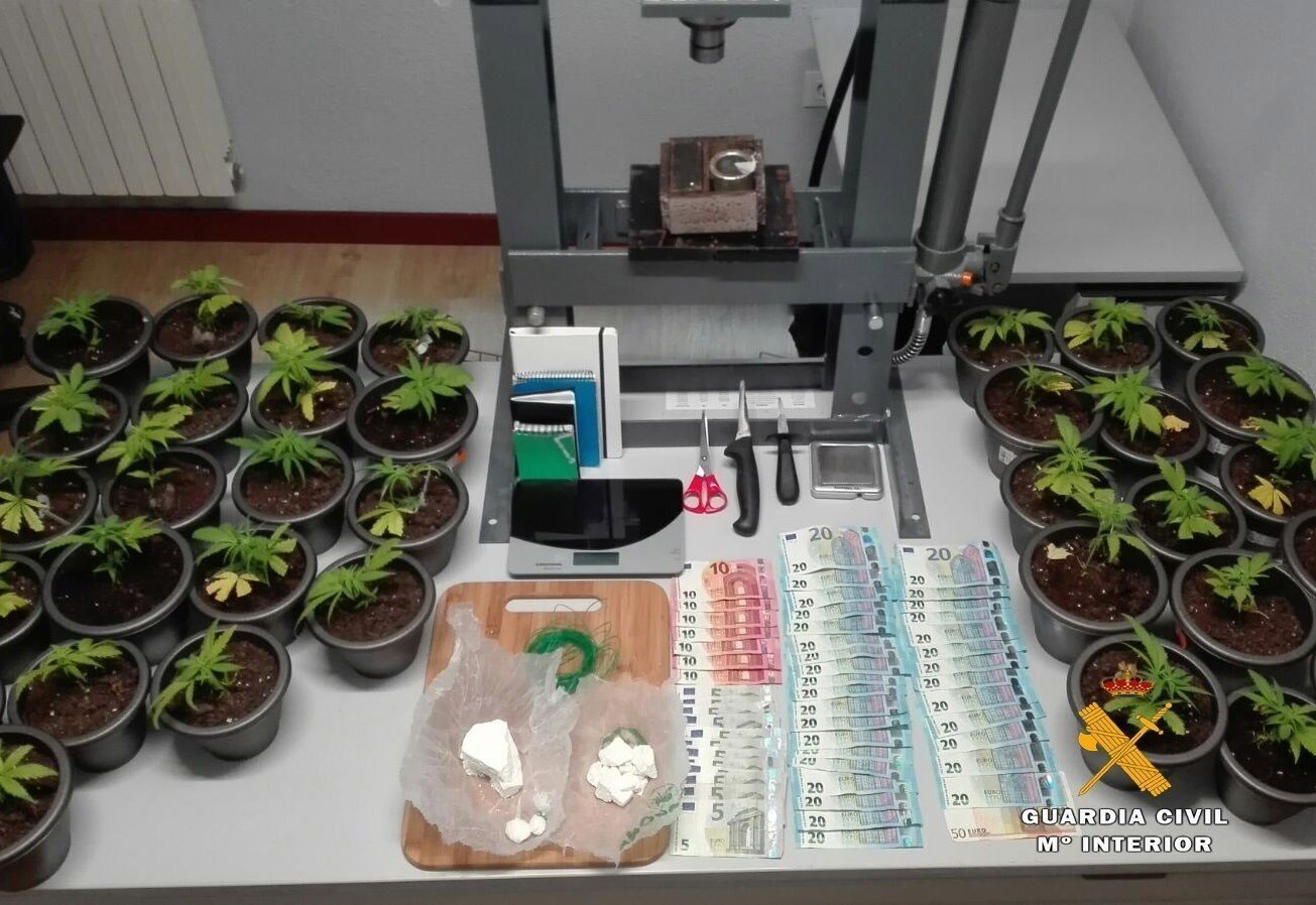 Posteriormente detuvieron al investigado, J.G.G., vecino de Treceño. En un registro en su domicilio los agentes encontraron 100 gramos de cocaína en roca, 35 plantas de marihuana en fase de crecimiento, una prensa hidráulica supuestamente utilizada para la preparación de cocaína en cantidades de cierta importancia, así como unos 800 euros, basculas de precisión, elementos para la distribución de droga y cuadernos con anotaciones contables.