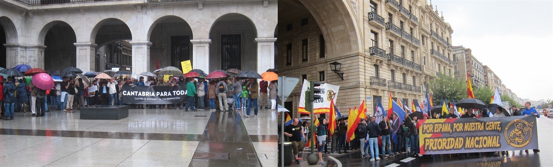 Santander ha sido escenario este sábado por la tarde de dos manifestaciones simultáneas con distinto mensaje ya que mientras que una reivindicaba una 'Cantabria para todas (las personas)' la otra, a escasos metros, reclamaba "prioridad" para los españoles.