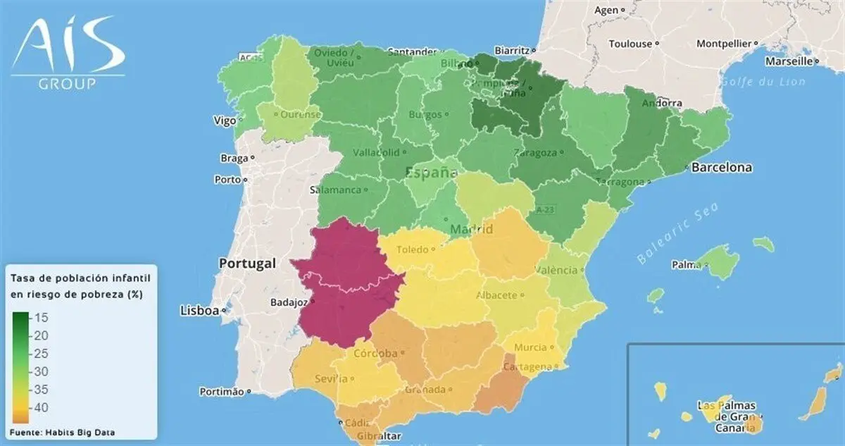 Además de las provincias extremeñas y andaluzas, entre las que presentan una tasa superior al 40% se encuentra también Las Palmas (Canarias), con un 40,9% de niños residiendo en hogares en riesgo de pobreza.