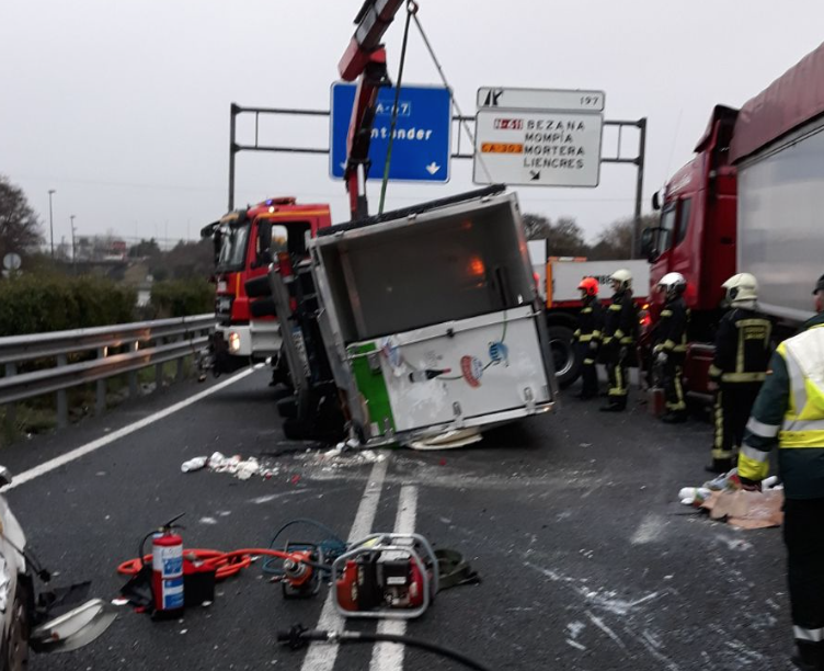 Según información de la Dirección General de Tráfico, el accidente se ha producido sobre las 7.34 horas en el punto kilométrico 197,5, en Santa Cruz de Bezana, y ha originado retenciones desde las 8.40 horas desde los kilómetros 196,5, en Bezana, a 183, en Torrelavega. El tráfico ha sido desviado por diversos trayectos alternativos.