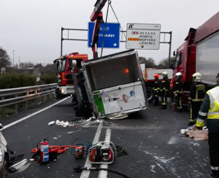 Según información de la Dirección General de Tráfico, el accidente se ha producido sobre las 7.34 horas en el punto kilométrico 197,5, en Santa Cruz de Bezana, y ha originado retenciones desde las 8.40 horas desde los kilómetros 196,5, en Bezana, a 183, en Torrelavega. El tráfico ha sido desviado por diversos trayectos alternativos.