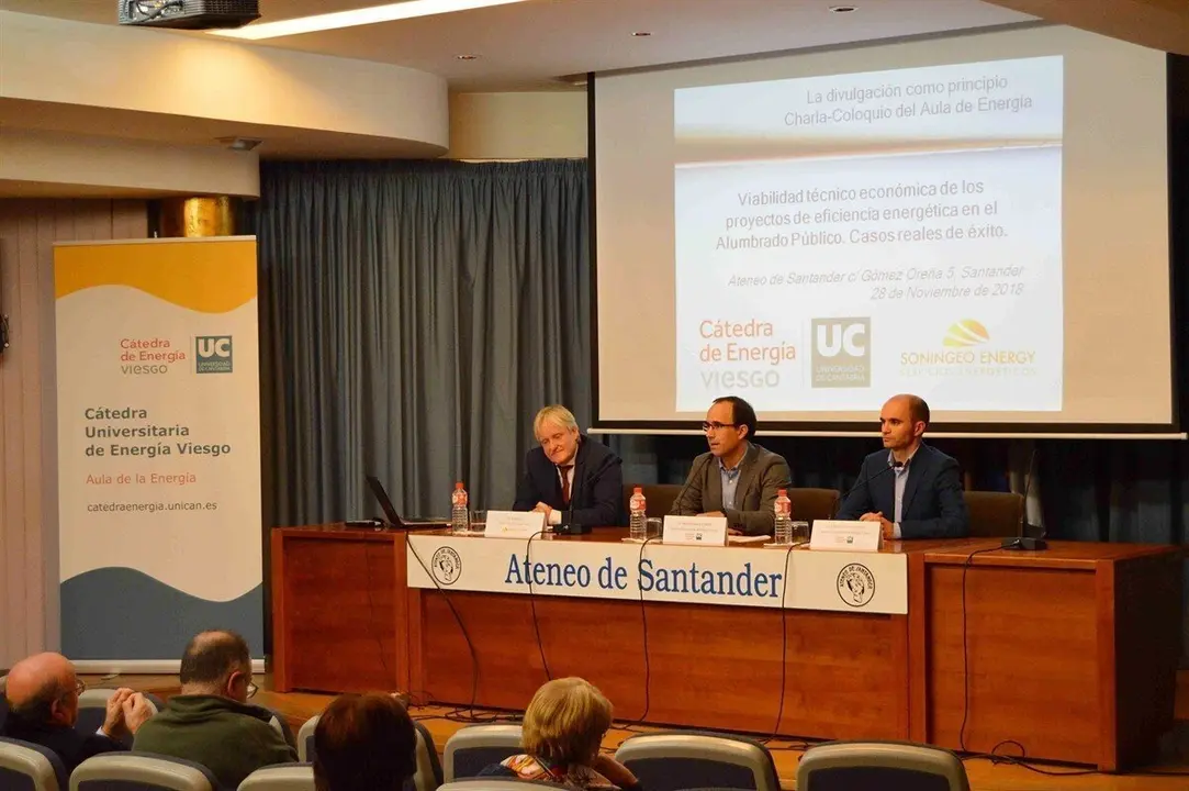 El Aula de Energía de la Cátedra Viesgo-UC ha abordado en su tercera cita la viabilidad técnico económica de los proyectos de eficiencia energética en el alumbrado público, de la mano del director general de Soningeo Energy, Rafael Gil.