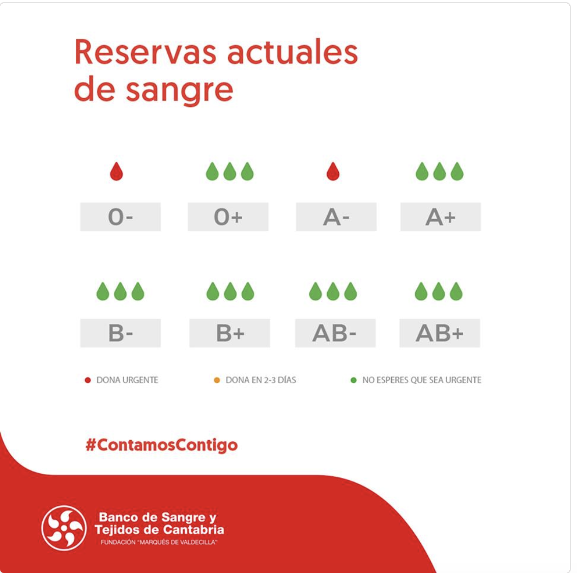 El Banco de Sangre y Tejidos de Cantabria requiere a la población para una donación urgente de sangre del tipo A- y 0- a través de un mensaje difundido a través de sus redes sociales.