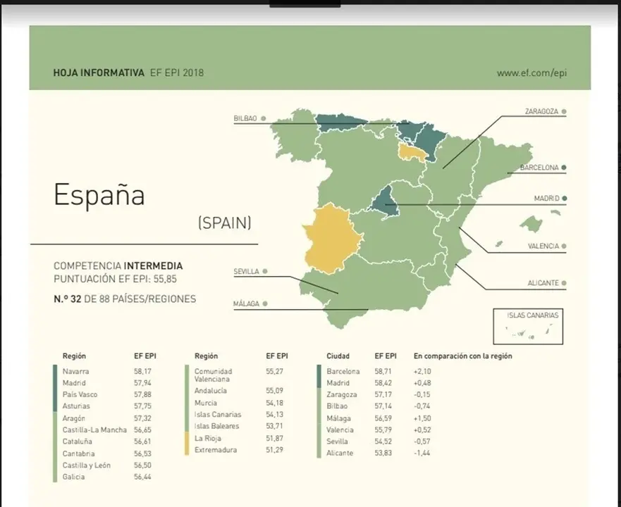 De esta forma, la comunidad se sitúa en la franja intermedia de conocimiento de inglés a nivel nacional, mientras que La Rioja y Extremadura se encuentran a la cola de este ránking.