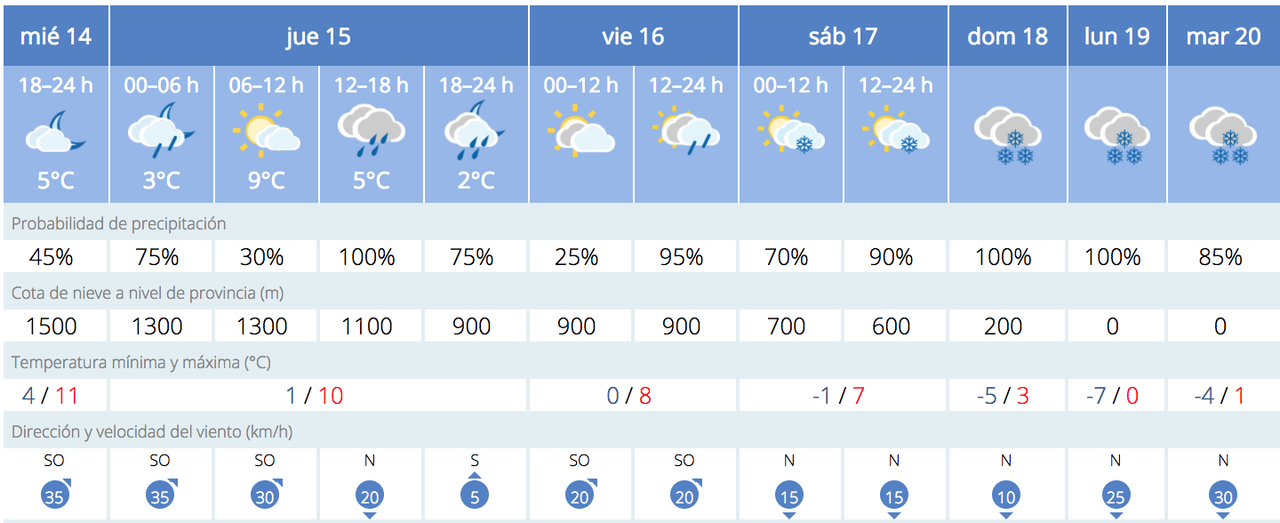 Predicción para el Domingo. Nuboso o cubierto con precipitaciones frecuentes. Cota de nieve 600-800 metros. Temperaturas en descenso. Heladas en zonas de montaña.Vientos del noroeste con intervalos de fuertes en el litoral.