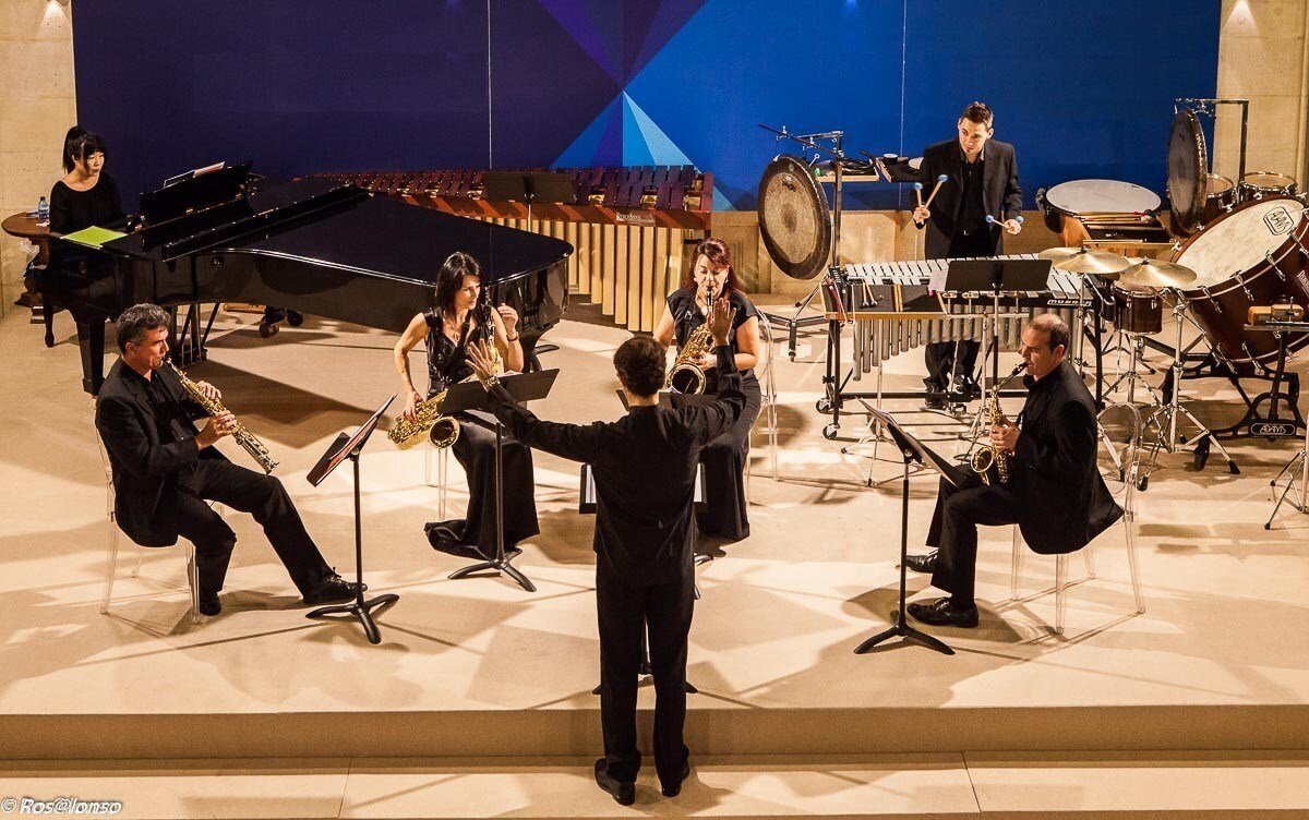 Sax-Ensemble surge en 1987 con el objetivo de potenciar la creación y difusión de música contemporánea. Se trata de un grupo de cámara flexible integrado como base por flauta, clarinete, violín, violonchelo, cuarteto de saxofones, piano, percusión y música electroacústica, pero que cuenta en los casos necesarios, con la participación de otros instrumentos de viento, cuerda y voz, en muchas de sus actuaciones.