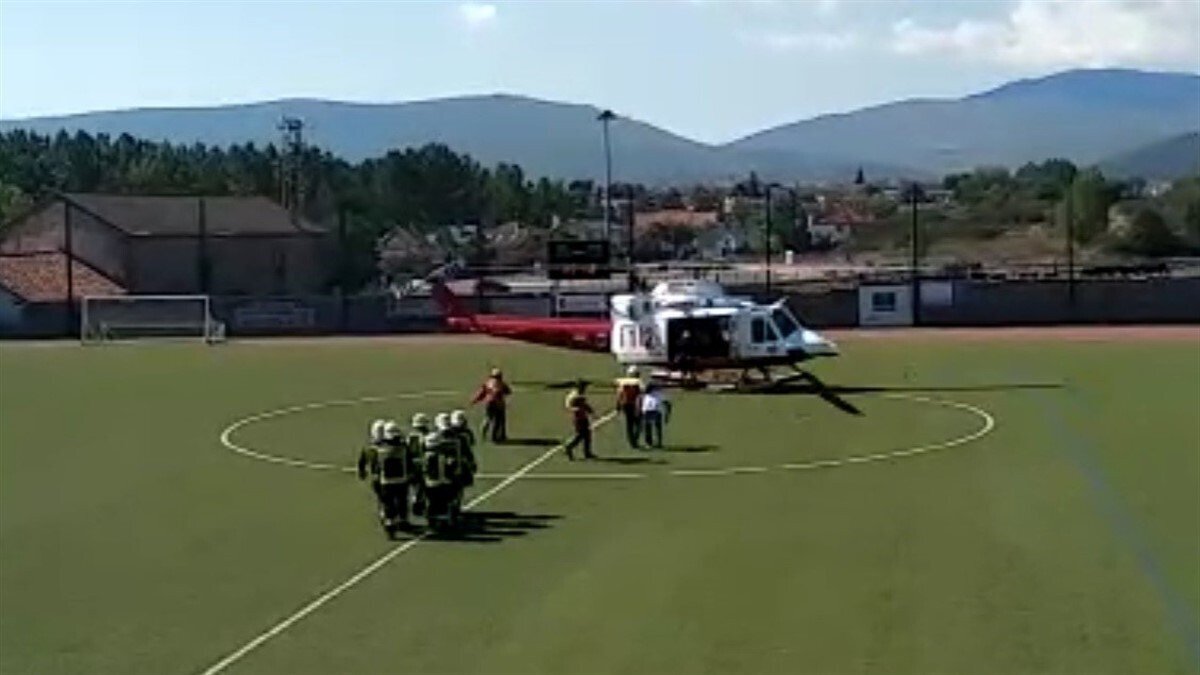 En esta segunda parte de la práctica, realizada en el campo de fútbol de la capital de Campoo, la aeronave ha tomado tierra en el recinto. Hasta la víctima han accedido un técnico de rescate del Gobierno y el médico de la aeronave, apoyados por bomberos del 112, que ha valorado e inmovilizado al afectado y le han asegurado en una camilla de rescate en la que se le ha trasladado al helicóptero, para su evacuación simulada a Santander.