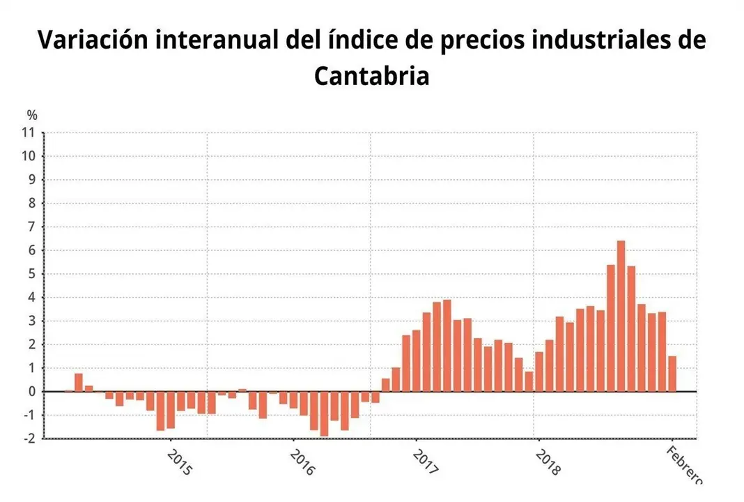 El Índice de Precios Industriales (IPI) subió un 1,5% en febrero en Cantabria respecto al mismo mes de 2018, impulsado por la energía, según ha informado este lunes el Instituto Nacional de Estadística (INE), que indica también que los precios retrocedieron un 1,1% en la región con relación con el pasado mes de enero.