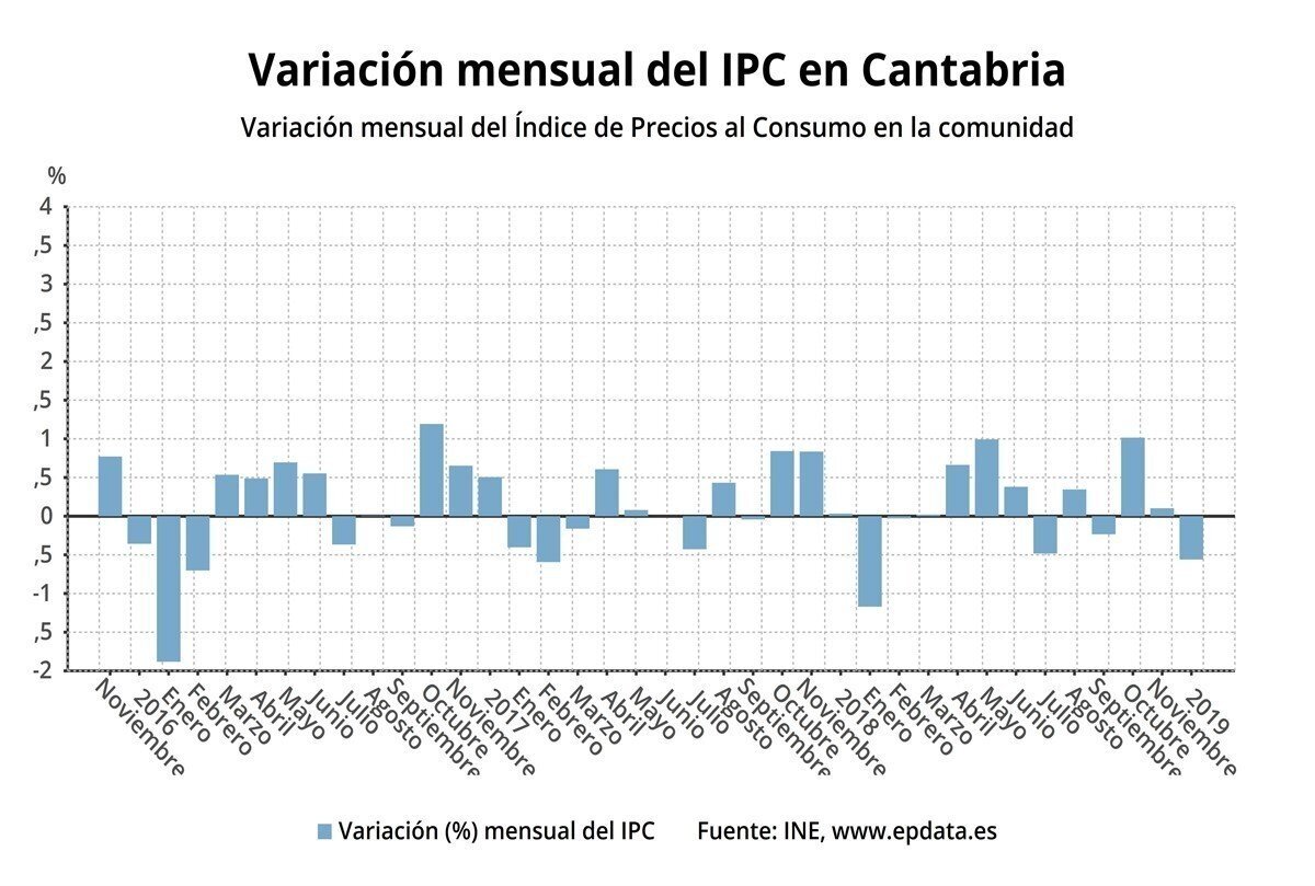 El Índice de Precios de Consumo (IPC) en Cantabria subió un 1% en diciembre de 2018 en comparación con el mismo mes del año anterior, dos décimas menos que la media nacional (1,2%) pero retrocedió un -0,6% respecto al mes anterior, según ha informado este martes el Instituto Nacional de Estadística (INE).