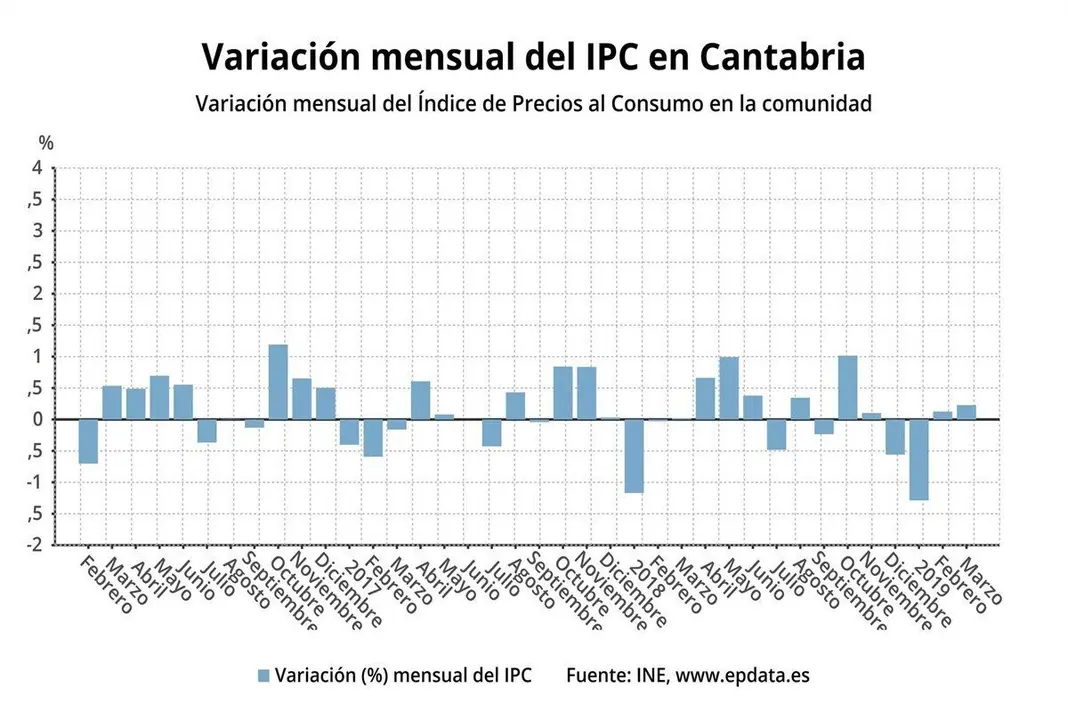 El Índice de Precios de Consumo (IPC) en Cantabria subió un 1,3% en marzo en comparación con el mismo mes del año anterior, lo mismo que la media nacional, y se incrementó dos décimas respecto al pasado mes de febrero, según ha informado este viernes el Instituto Nacional de Estadística (INE).
