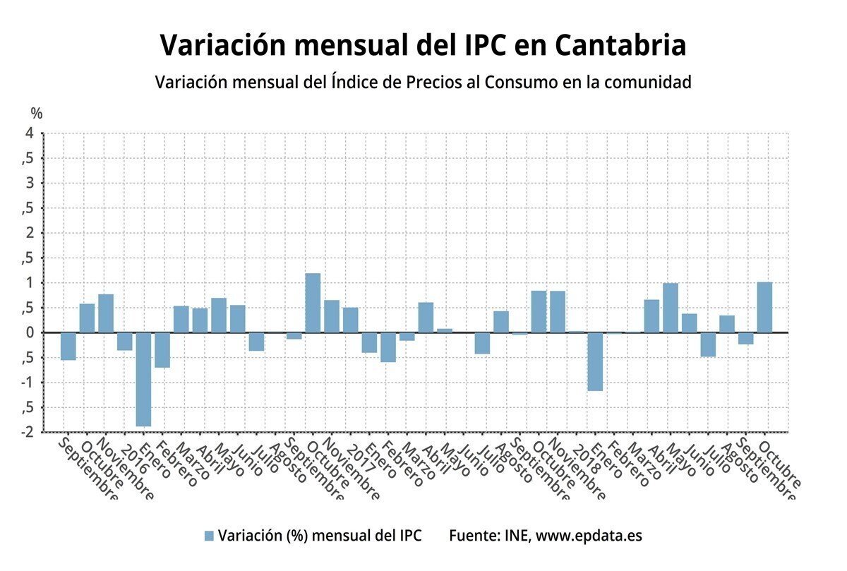 El Índice de Precios de Consumo (IPC) en Cantabria subió un 2,4% en octubre en comparación con el mismo mes del año anterior, una décima menos que la media nacional (2,3%), y se incrementó un 1% respecto al mes anterior, según ha informado este miércoles el Instituto Nacional de Estadística (INE).