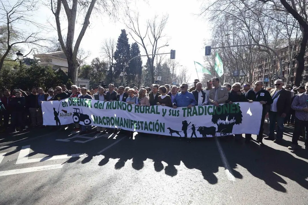 Miles de personas del mundo rural se han manifestado este domingo 3 de marzo en Madrid para pedir respeto hacia el mundo rural y sus tradiciones, entre las que se encuentran actividades como la caza, la pesca, la agricultura, la ganadería, la tauromaquia o incluso los espectáculos con animales, pero también para defenderse del "acoso" y los "ataques" que sufren por parte del sector animalista y ecologista.