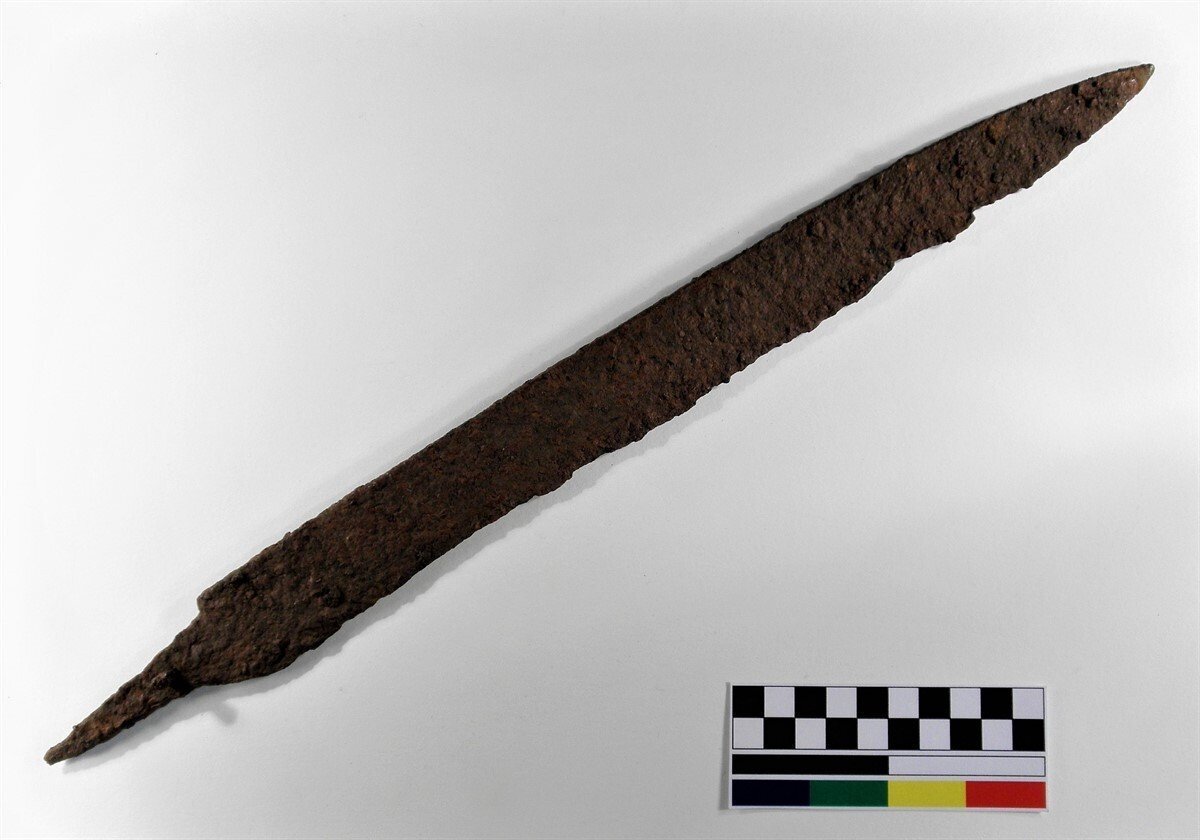 El 'scramasax', que presenta un muy buen estado de conservación, es de hierro y mide 43,5 cm de longitud, de los que 37 corresponden a la hoja y el resto a la espiga de enmangue, que conserva un remache para la sujeción de las cachas de la empuñadura, probablemente de madera y hoy perdidas.