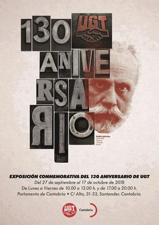 UGT inaugurará este miércoles, 26 de septiembre, en Cantabria, los actos conmemorativos de su 130 aniversario en el patio central del Parlamento regional, que acogerá también una exposición itinerante de 14 paneles históricos y 6 temáticos desde este 27 de septiembre hasta el próximo 17 de octubre.
