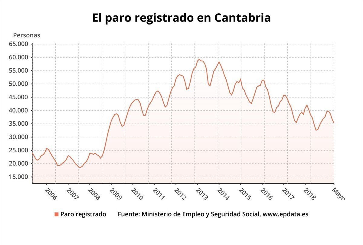 Además, hubo 1.830 parados menos en Cantabria, un -4,9%, en relación con mayo de 2018, en este caso, por debajo del descenso medio nacional (-5,3%).