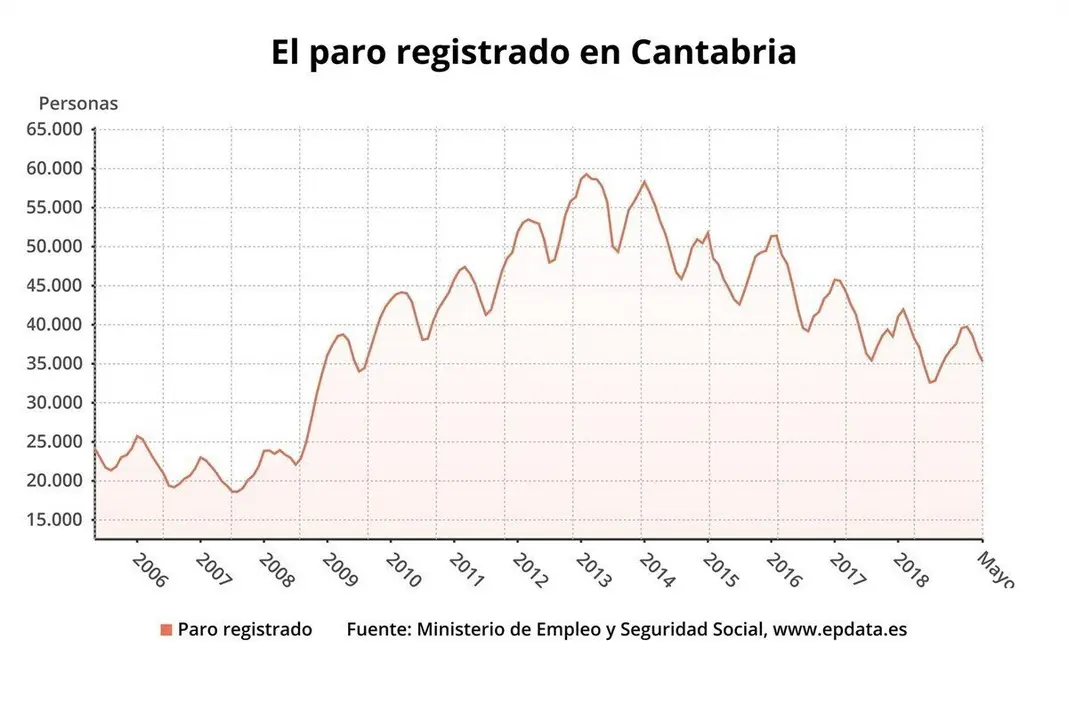 Además, hubo 1.830 parados menos en Cantabria, un -4,9%, en relación con mayo de 2018, en este caso, por debajo del descenso medio nacional (-5,3%).