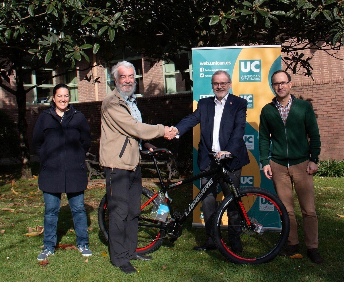 El rector de la Universidad de Cantabria (UC), Ángel Pazos, y el vicerrector de Campus, Servicios y Sostenibilidad, Mario Mañana, han entregado este lunes al profesor Juan Carlos García Codron, el premio del concurso de vídeos cortos organizado por la Oficina Ecocampus y que ha consistido en una bicicleta de montaña.