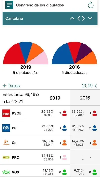 El Partido Socialista ha ganado las elecciones generales de este domingo en Cantabria por primera vez en 26 años, y ha conseguido dos diputados, mientras que el PP se desploma, pierde 20 puntos y cae a la segunda posición, quedándose con un único escaño de los dos que tenía. El PRC ha conseguido por primera vez en su historia un asiento en el Congreso, tras situarse como la cuarta fuerza más votada.