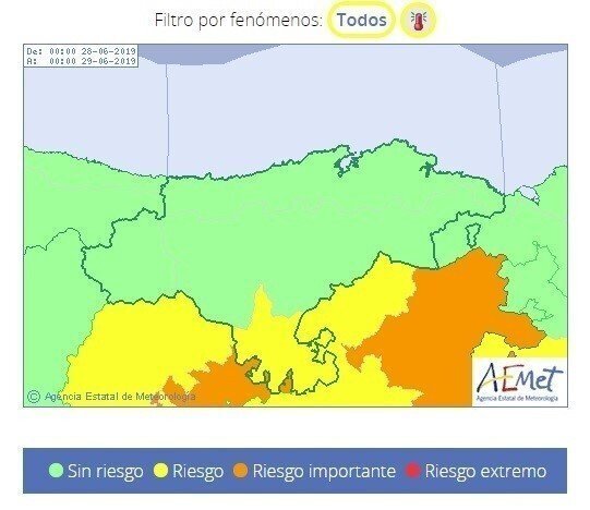 En Cantabria, este aviso por altas temperaturas en la Cantabria del Ebro, la del sur de la comunidad, estará activo entre las 14.00 y las 20.00 horas.