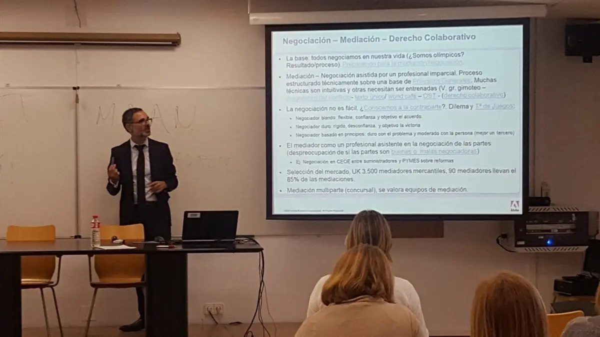 Vázquez de Castro ha intervenido en la primera jornada, abordando temas como la figura del mediador, el procedimiento de mediación, además de hacer un análisis práctico de la normativa europea, estatal y autonómica en materia de mediación.