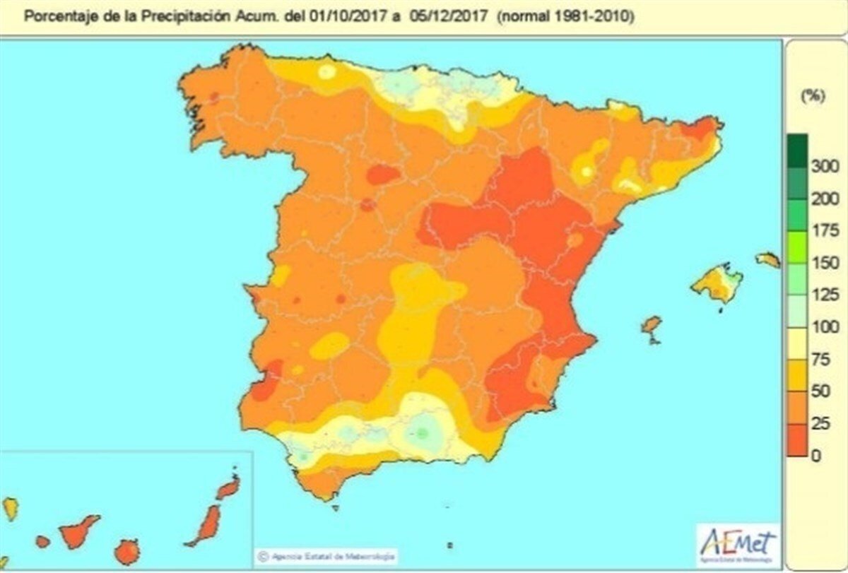El conjunto de la Península Ibérico --salvo en Cantabria, País Vasco y el valle del Guadalquivir-- y los archipiélagos, a excepción del norte de Mallorca, ha registrado, entre el 1 de octubre y el 5 de diciembre, un volumen de lluvias un 57% inferior a lo normal para esta época, según la Agencia Estatal de Meteorología (AEMET).