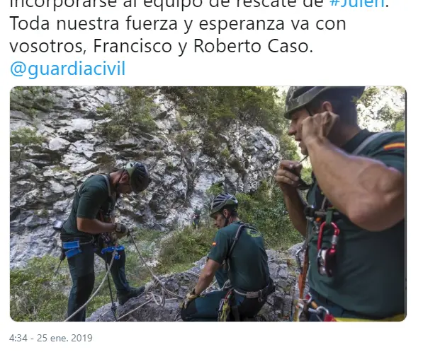 Especialistas en microvoladuras del #GREIM de #Potes se dirigen a #Totalán para incorporarse al equipo de rescate de #Julen. Toda nuestra fuerza y esperanza va con vosotros, Francisco y Roberto Caso. @guardiacivil pic.twitter.com/lxSvvt3GEj