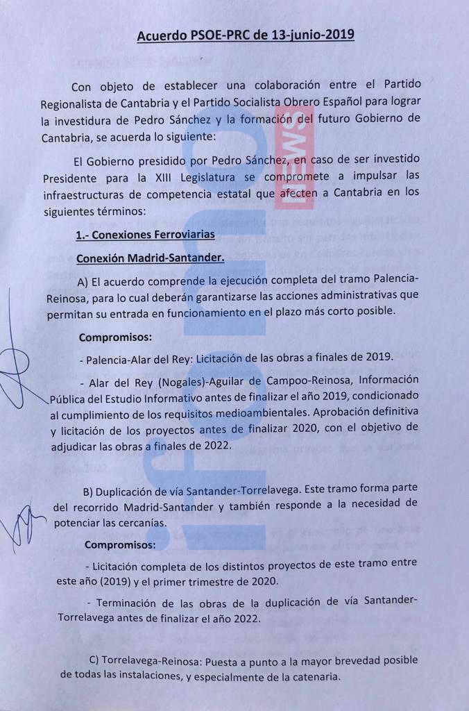 Este medio ha tenido acceso al documento que han firmado el Diputado Nacional del PRC, Jose María Mazón y el Ministro de Fomento en funciones y Secretario de Organización del PSOE, Jose Luis Ábalos.