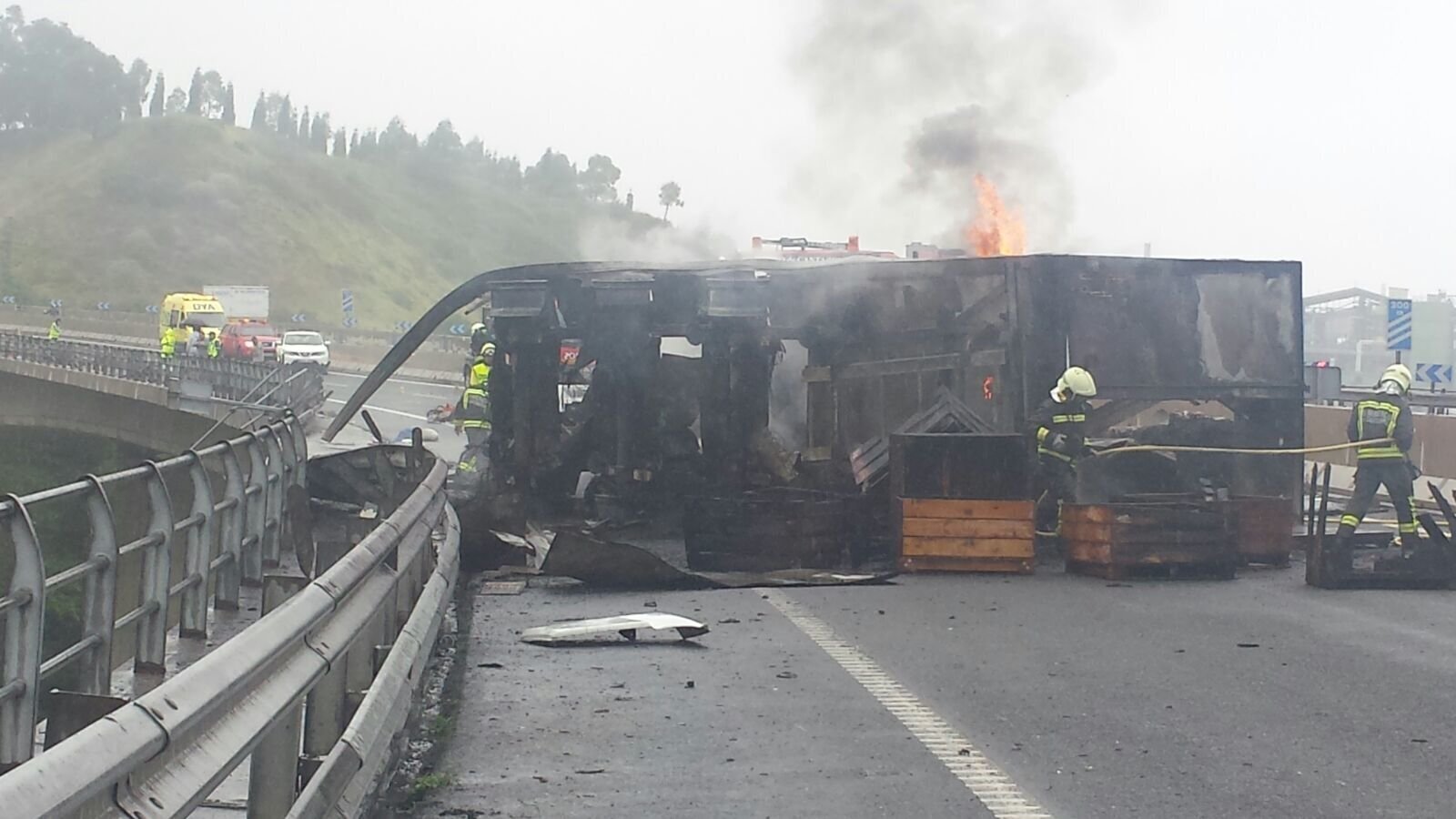 La cabeza tractora del vehículo pesado ha quedado colgando del puente de Ontón, del que posteriormente ha caído, y se ha incendiado Un hombre ha resultado fallecido al salirse de la vía el tráiler que conducía a la altura del punto kilométrico 141 de la A8, coincidente con el puente de Ontón. El vehículo pesado ha quedado con la cabina colgando del viaducto, y como consecuencia del impacto contra los protectores laterales del mismo se ha incendiado. Tras el accidente, producido en dirección Vizcaya, el conductor se ha precipitado, por causas que se desconocen, a una vía secundaria que transcurre por debajo del viaducto. A esa misma carretera ha caído posteriormente la cabeza tractora del camión que se ha desprendido del remolque. El Centro de Gestión de Emergencias 112 del Gobierno de Cantabria ha recibido una llamada alertando del suceso minutos antes de las 14:00 horas. Hasta el lugar del accidente se ha movilizado a bomberos del propio servicio autonómico, pertenecientes al parque de Laredo, a bomberos municipales de Castro Urdiales, a sanitarios del 061, a agentes de la Guardia Civil, a personal de mantenimiento de carreteras, y se ha prealertado al helicóptero del Ejecutivo por si fuera necesaria su presencia. Asimismo, el 112 de Vizcaya, que también ha recibido avisos del incidente, ha movilizado a bomberos de esta provincia. En el lugar del han estado también miembros de la DYA. A su llegada, los bomberos de Castro Urdiales han trabajado en la extinción del incendio de la cabina en la carretera secundaria en la que se encontraba los restos del camión, apoyados por bomberos de Vizcaya. Estos últimos han iniciado la extinción también del contenedor de carga en la autovía. Los intervinientes vascos han sido relevados en la A8 por los efectivos del 112, que ha terminado de sofocar las llamas del remolque. Con el fuego controlado los bomberos del Gobierno de Cantabria han procedido a la retirada de todos los elementos con riesgo de caída de la parte superior del puente, alguna de las piezas de gran tamaño y peso, como protectores de hormigón, y han desplazado el remolque del tráiler hacia el interior de la autovía para garantizar la seguridad de los bomberos del Castro Urdiales en el proceso de recuperación del cuerpo, del que ha certificado la muerte personal sanitario del 061.